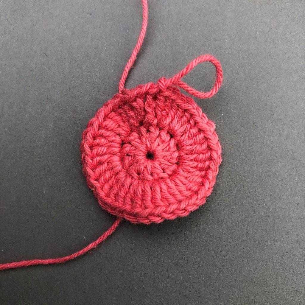 Dafür häkelst du 5 Luftmaschen, die du mit einer Kettmasche zum Ring schließt. In diesen Ring häkelst du nun solange feste Maschen hinein und schließlich übereinander, bis dein Stempel die erwünschte Größe hat. Ich hab‘ übrigens 30 feste Maschen in den Luftmaschenring gesetzt.