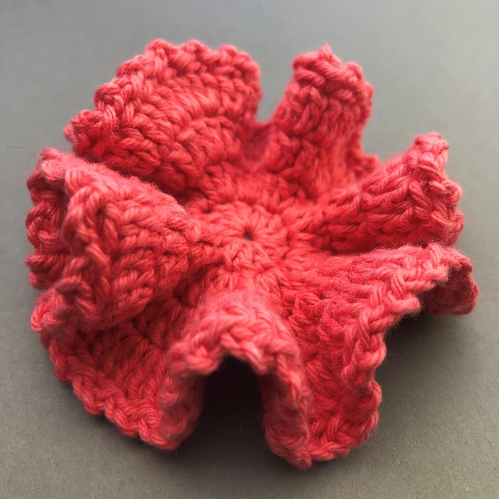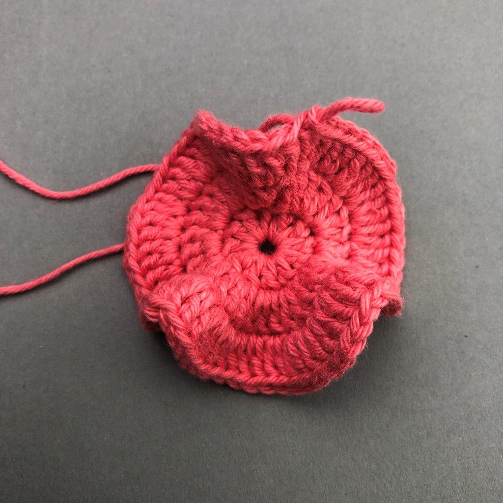 Du siehst, dass sich die Häkelei aufgrund der vielen Maschen zu wellen beginnt.