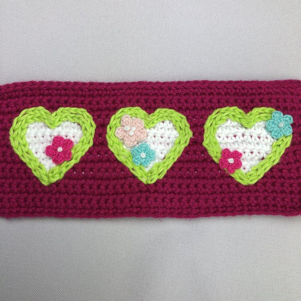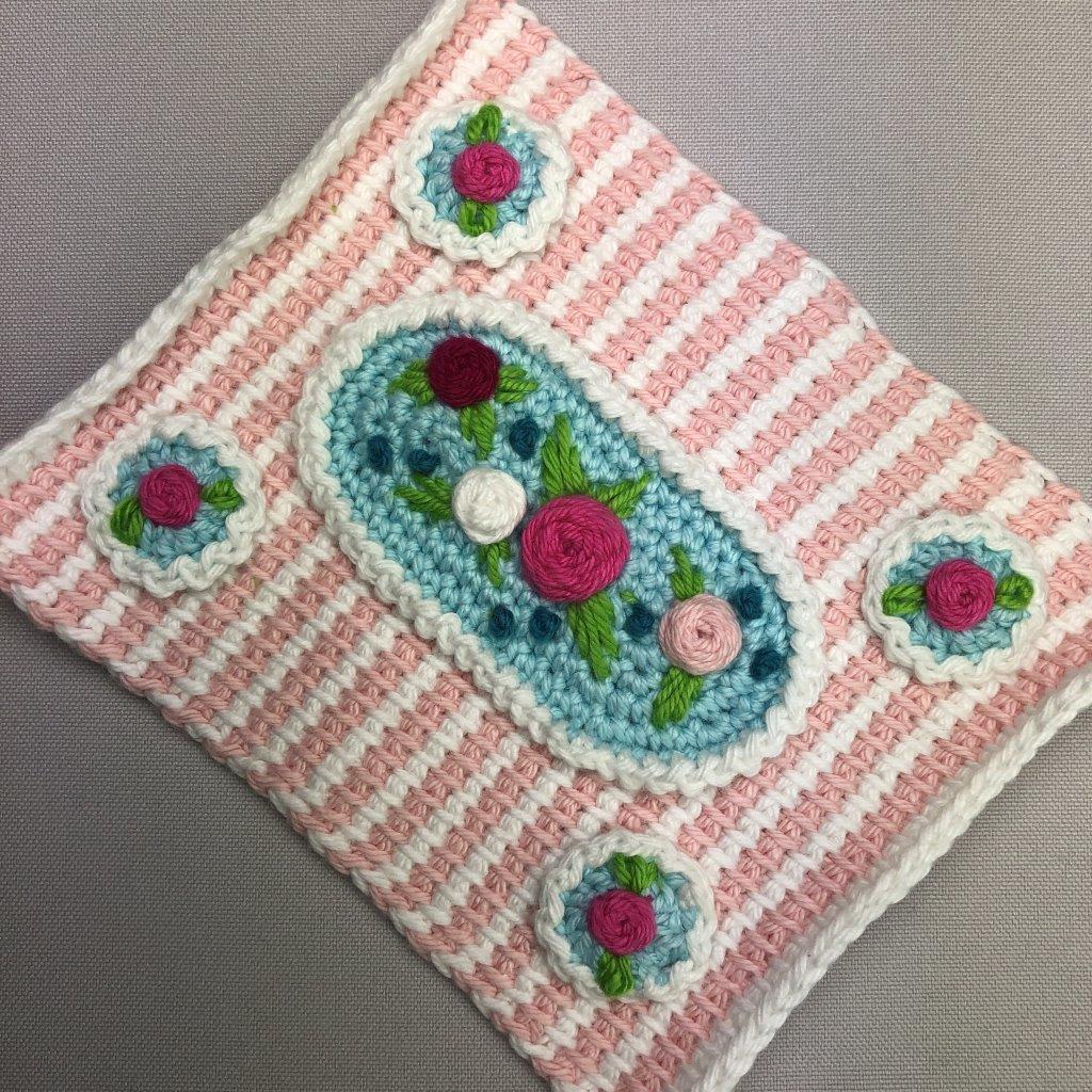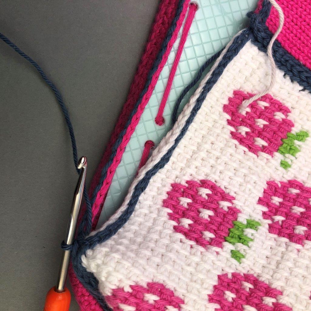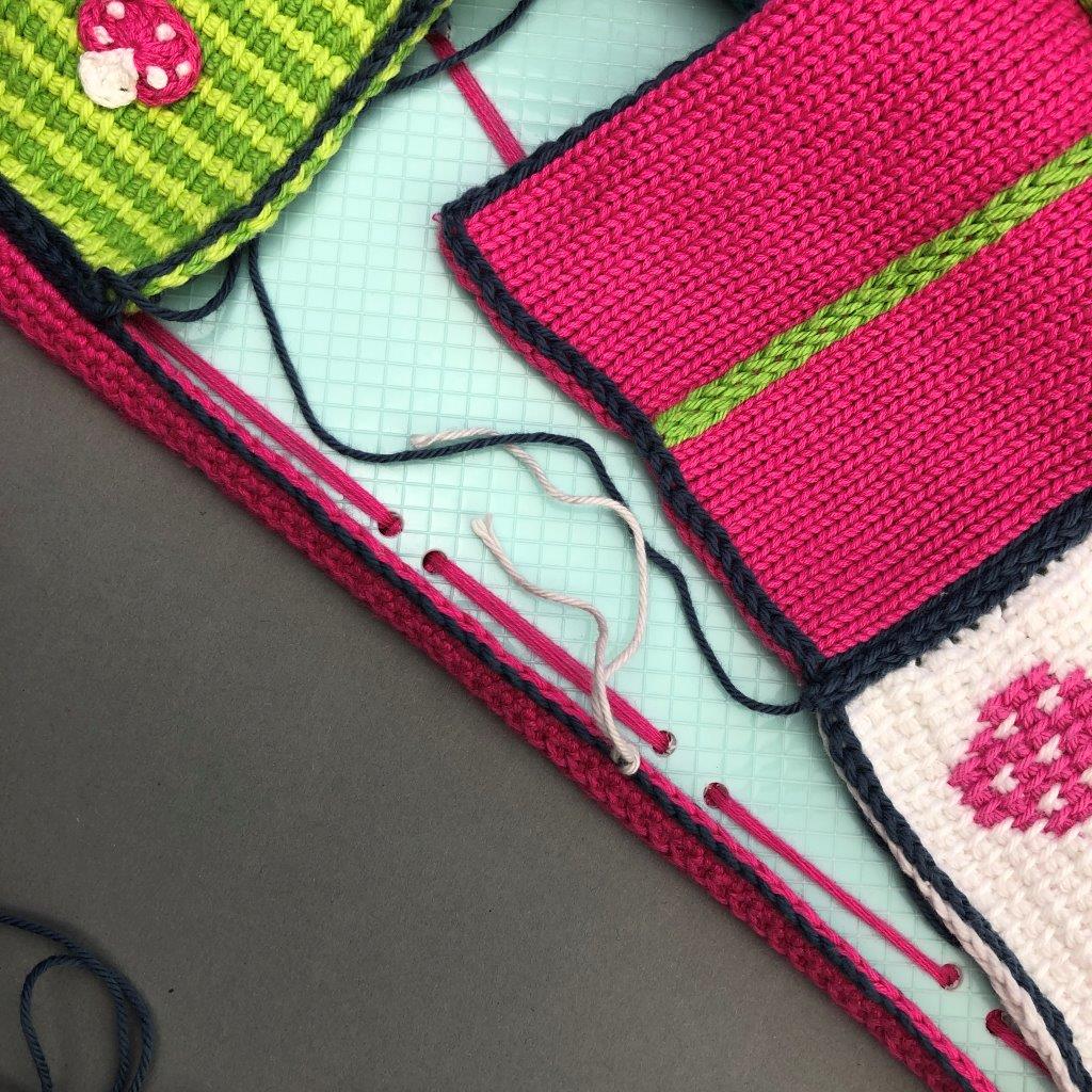 (Anmerkung: Du kannst auf dem Bild ziemlich gut erkennen, dass ich mit erwähnter Kettmaschenreihe eine fehlerhafte Größe noch korrigieren kann. Der rosafarbene Patch war ein klein wenig zu groß geraten, also hab‘ ich die Kettmaschen entsprechend eingerückt!)