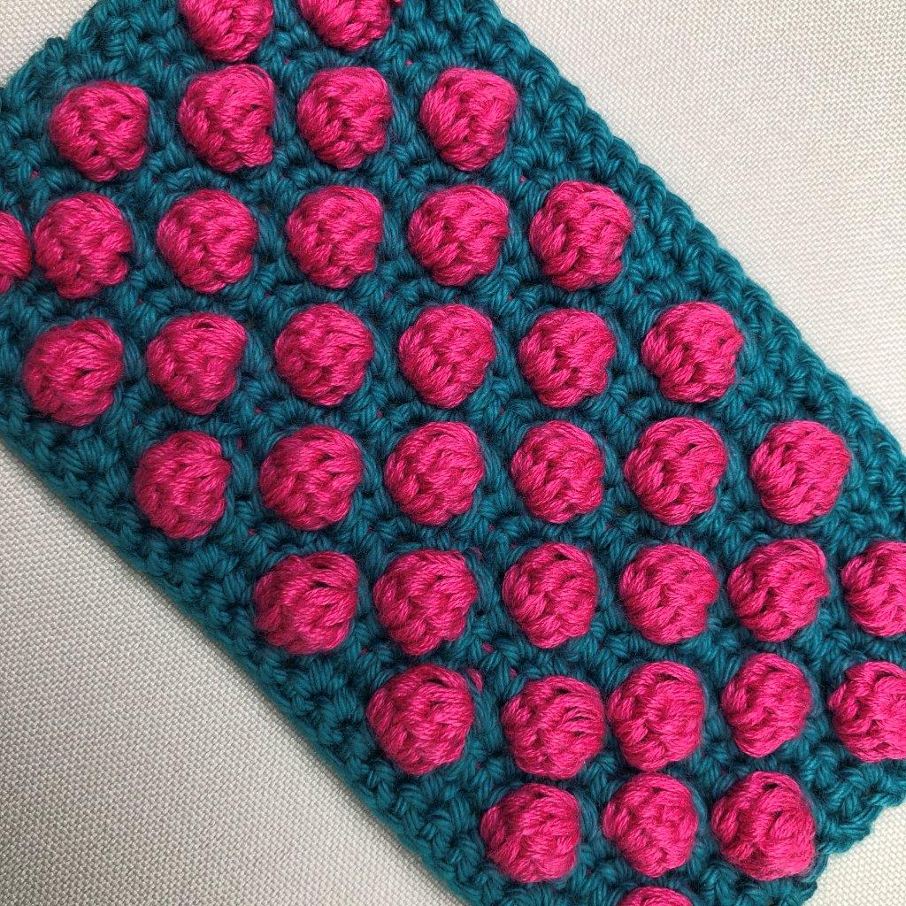Die Reihen, die jetzt noch folgen, bilden später den Saum. Entweder häkelst du einfach 3 Reihen feste Maschen in pink, oder aber du fügst noch ein paar dunkelblaue Noppen ein. In diesem Fall häkelst du eine Reihe fester Maschen, eine Reihe in der sich 5 feste Maschen mit einer Noppe, bestehend aus 5 zusammen abgemaschten Stäbchen, abwechseln und danach eine letzte Reihe fester Maschen.