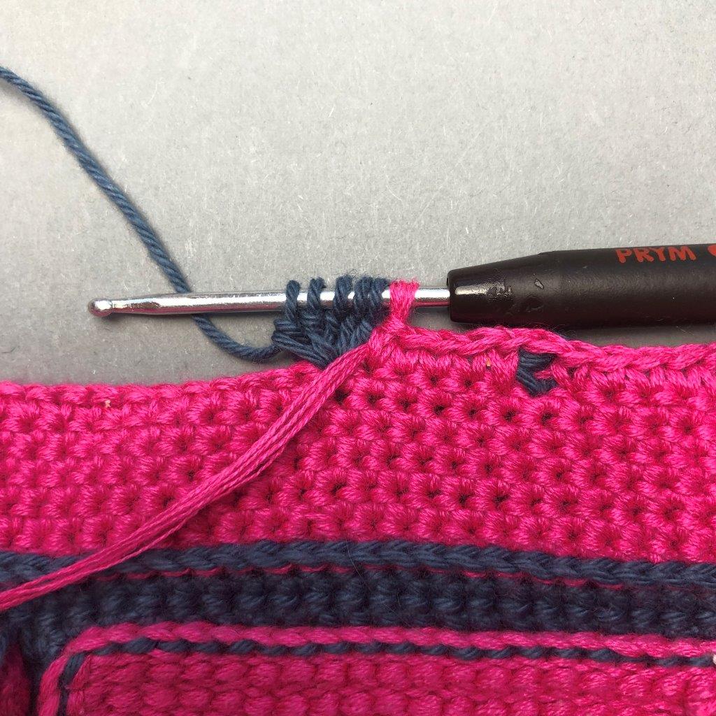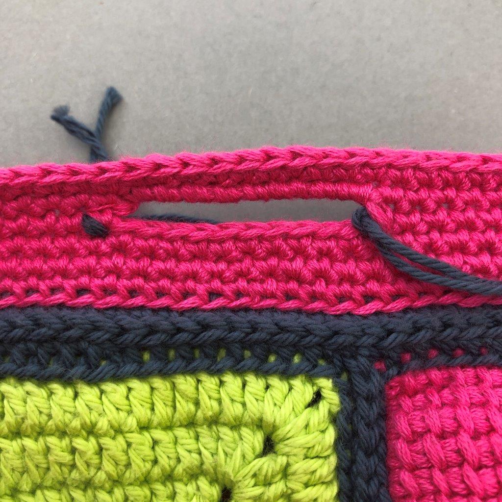 … dann eine Reihe Kettmaschen in pink, eine Reihe fester Maschen in das obere Maschenglied der vorherigen Kettmaschen (das ergibt den messerscharfen Farbübergang von blau nach pink, ohne störende Maschenfüßchen) und dann eine ganz normale Reihe fester Maschen. In der nächsten Reihe werden die Schlitze für die Aufnahme der Henkel gearbeitet. Da sich meine Schlitze über 10 Maschen erstrecken (hängt von der Breite der Henkel ab), habe ich in der folgenden Reihe an den entsprechenden Stellen – hier 14 cm rechts und links der Taschenseite – anstelle von 10 festen Maschen 10 Kettmaschen und an gleicher Stelle in der darauffolgenden Reihe 10 Luftmaschen gehäkelt.