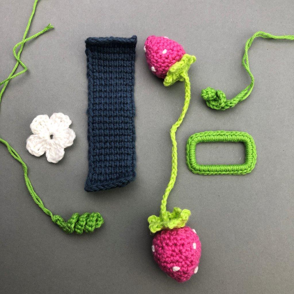 Dann hab‘ ich die 4 Teile noch verziert, indem ich das eine oder andere gehäkelt habe. Der Phantasie (mit „ph“ find‘ ich’s nach wie vor schöner!) sind natürlich keine Grenzen gesetzt. Hier seht ihr am Beispiel EINER zukünftigen Schlaufe die dafür notwendigen Einzelteile …