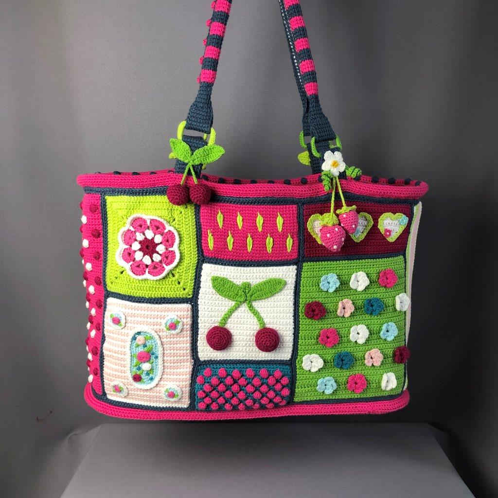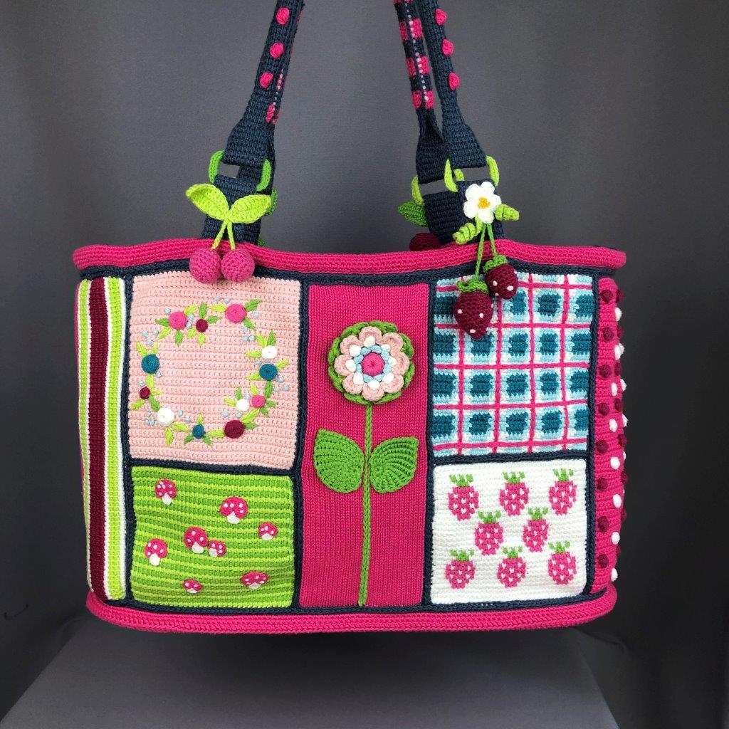 Beim Entwickeln der Patches hab‘ ich auf alle Techniken zurückgegreiffen, die ich beherrsche, sprich stricken, häkeln, sticken, tunesisch häkeln, „granny-squaren“, „amigurimisieren“ und applizieren, weswegen meine Tasche unter dem Arbeitstitel „all I can do“ zu voller Größe heranreifte. Und da das extrem abwechslungsreich war, hat das auch richtig Spaß gemacht!