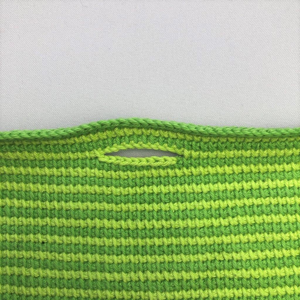 Außerdem kannst du auf dem Foto bereits einen dieser Schlitze erkennen, in die später die Enden der Henkel eingeführt werden. Für die beiden Schlitze kettest du in Reihe 92 beidseitig 36 Maschen vom Rand entfernt jeweils 10 Maschen ab, um sie in der nächsten Reihe wieder aufzunehmen. Schlitze fertig!!!