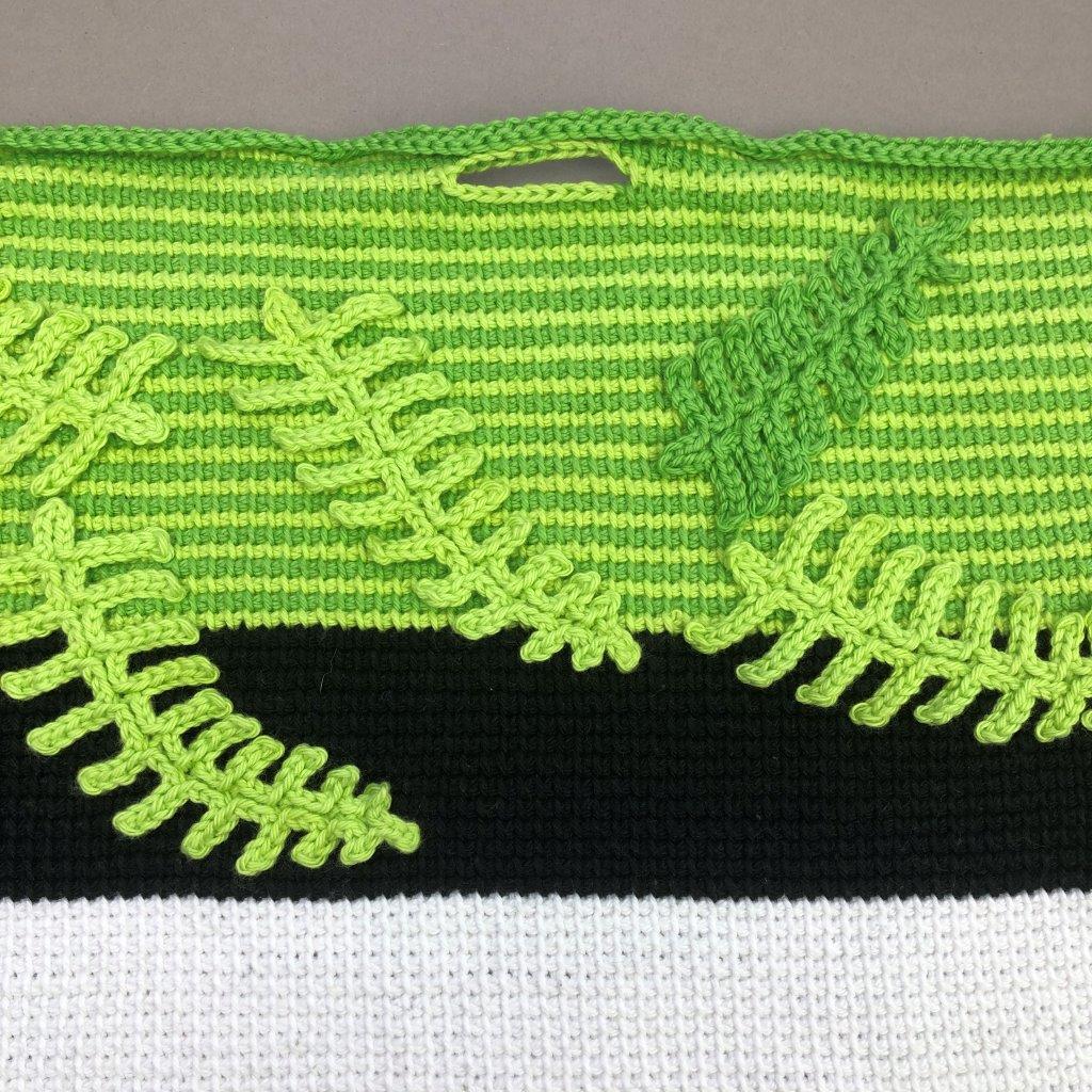 Die Streifen an sich sind 13 Reihen hoch. Bei 5 Blockstreifen macht das also 5 x 13 = 65 Reihen. Ab Reihe 66 beginnst du in Farbe „grün“ weiterzuhäkeln. Wenn du genau hinschaust …