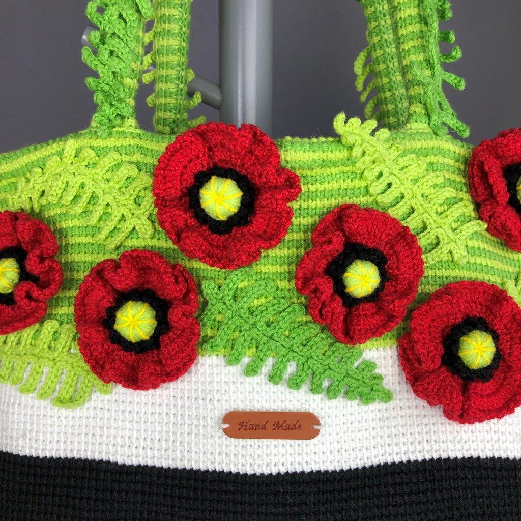 … erkennst du, dass ich mit zwei unterschiedlichen Grüntönen gearbeitet habe, die ich Reihe für Reihe gewechselt habe. Das geht natürlich nur beim tunesischen Häkeln, da du ansonsten den Rest deines Lebens Fäden-Vernähen müsstest. Entscheidest du dich für sie Normal-Häkel-Variante, wechselst du natürlich alle 2 Reihen die Farbe. Ich persönlich finde, dass damit der Untergrund für die Mohnblüten und -blätter lebendiger wirkt. Selbstverständlich kannst du aber auch einfach nur „grün“ häkeln.