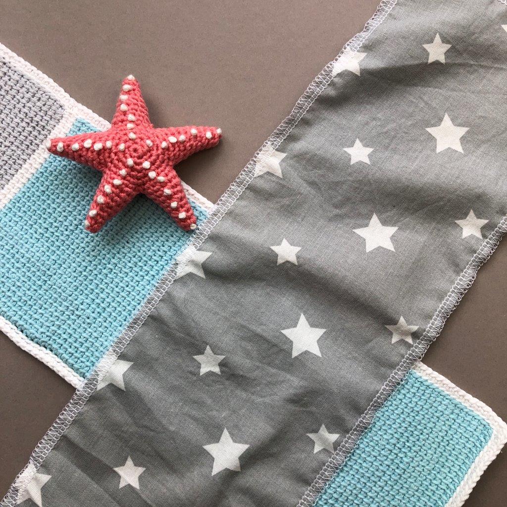 Für diesen Streifen habe ich 31 Maschen angeschlagen und 74 Reihen in Farbe „türkis“ gehäkelt. Da ich diese Streifen noch verziert habe, ging’s dann mit 2 Reihen „weiß“ weiter um schlussendlich noch 29 Reihen in Farbe „silber“ anzufügen. Möchtest du einfarbig arbeiten häkelst du also insgesamt 95 Reihen in deiner favorisierten Farbe. Da du vielleicht ein völlig anderes Garn verwenden möchtest, sei hier erwähnt, dass „mein Lappen“ 13 cm breit und ca. 43 cm lang ist. Aber auch diese Maße sind natürlich nicht in Stein gemeißelt. Jeder so wie er möchte! Und wo wir schon dabei sind: du erzielst ein ganz ähnliches Ergebnis, wenn du mit normalen festen Maschen arbeitest.