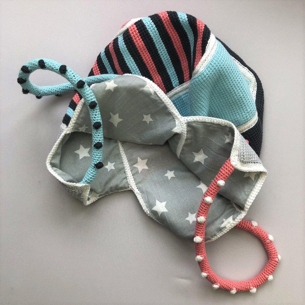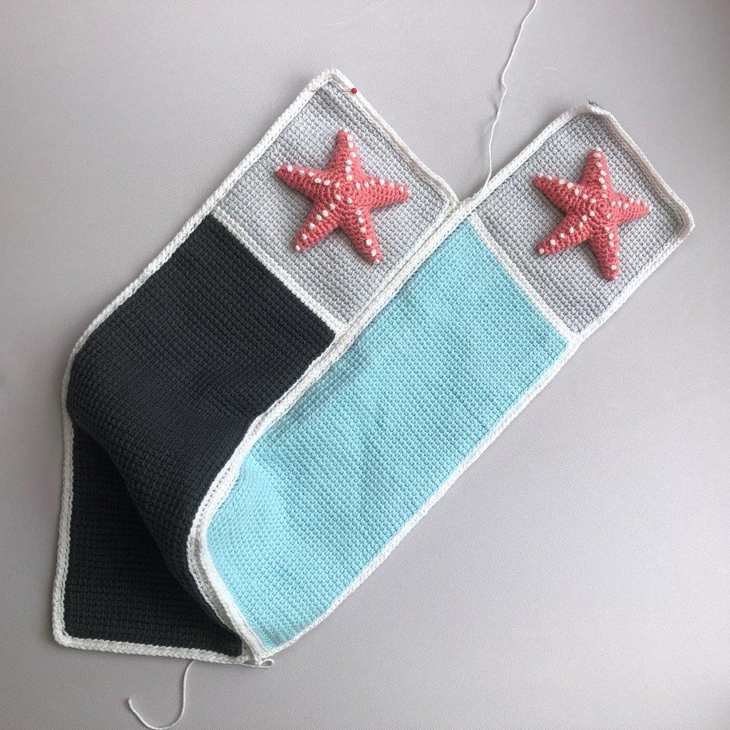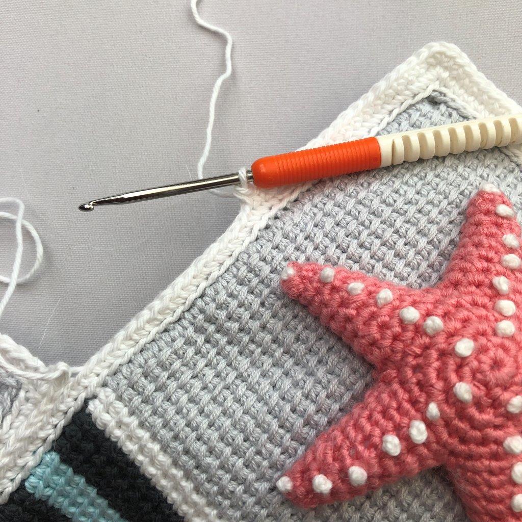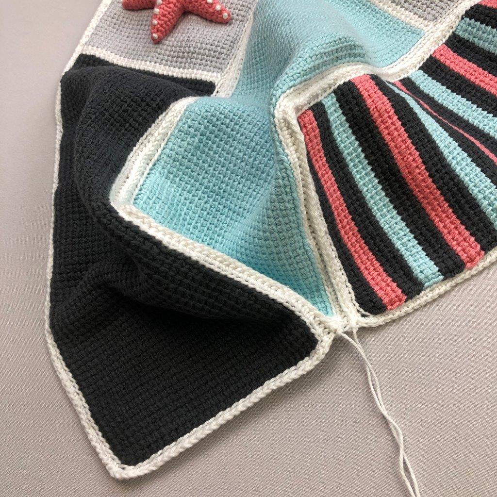 Danach habe ich den ganzen Streifen weiß umhäkelt. Damit der Farbkontrast schön sauber ist, habe ich zunächst eine Reihe Kettmaschen gehäkelt und flugs noch eine Reihe fester Maschen obendrauf gesetzt. Wenn du genau wissen möchtest wie ich das gemacht habe, dann schau‘ auf meinem Instagram-Feed nach (Link rechts im Seitenbereich). Da beschreibe ich das ausführlicher. Auf diese Weise entsteht im oberen Bereich des rechteckigen Lappens ein schöner „Rahmen“, den du mit allem was das Herz begehrt füllen kannst.