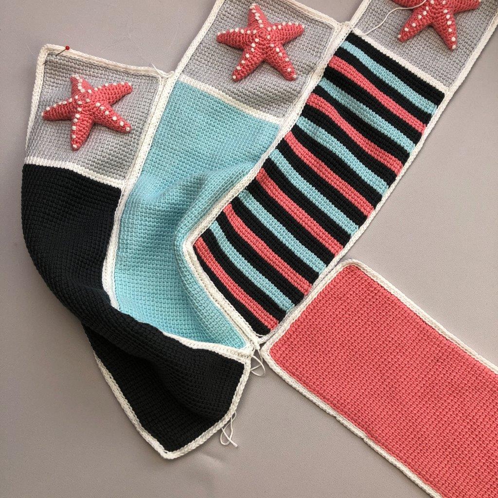 Zunächst einmal häkelst du 4 gleichgroße Streifen.